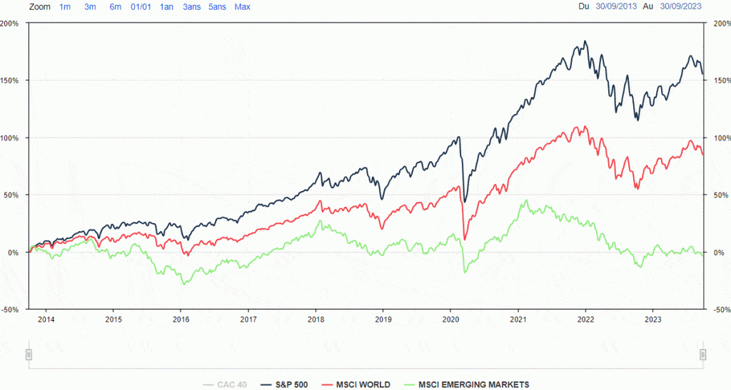 Le S&P500 surperforme les deux actifs depuis extrêmement longtemps certes il peux sous performer a partir d’aujourd’hui mais je pense qu’un actif qui surperforme un autre depuis extrêmement longtemps a plus de chance de surperformer que de sous performer. Il peut être très discipliné mais acheter des actifs qui sous performe un autre ne le feras pas gagner plus d’argent. Le MSCI world qui est a 73% composé d’entreprise américaine donc surtout US autant prendre le S&P500 ensuite si tu souhaites garder le emerging marcket tu le peux mais il le sous performe et en plus de ça tu as des frais de gestion plus élevé 0,30% et pour le S&P500 il est a 0,12% il ne faut pas oublier les frais composé qui gratte ton capitale le euro stoxx 600 est a 0,18% donc plus avantageux que le emerging marcket. Avec ça tu es diversifié tu as les US et l’Europe de plus les entreprises ne sont pas que en Europe les entreprise américaine par exemple vendent a l’étranger pas que en Amérique tout comme l’Europe vends sur d’autre continent.