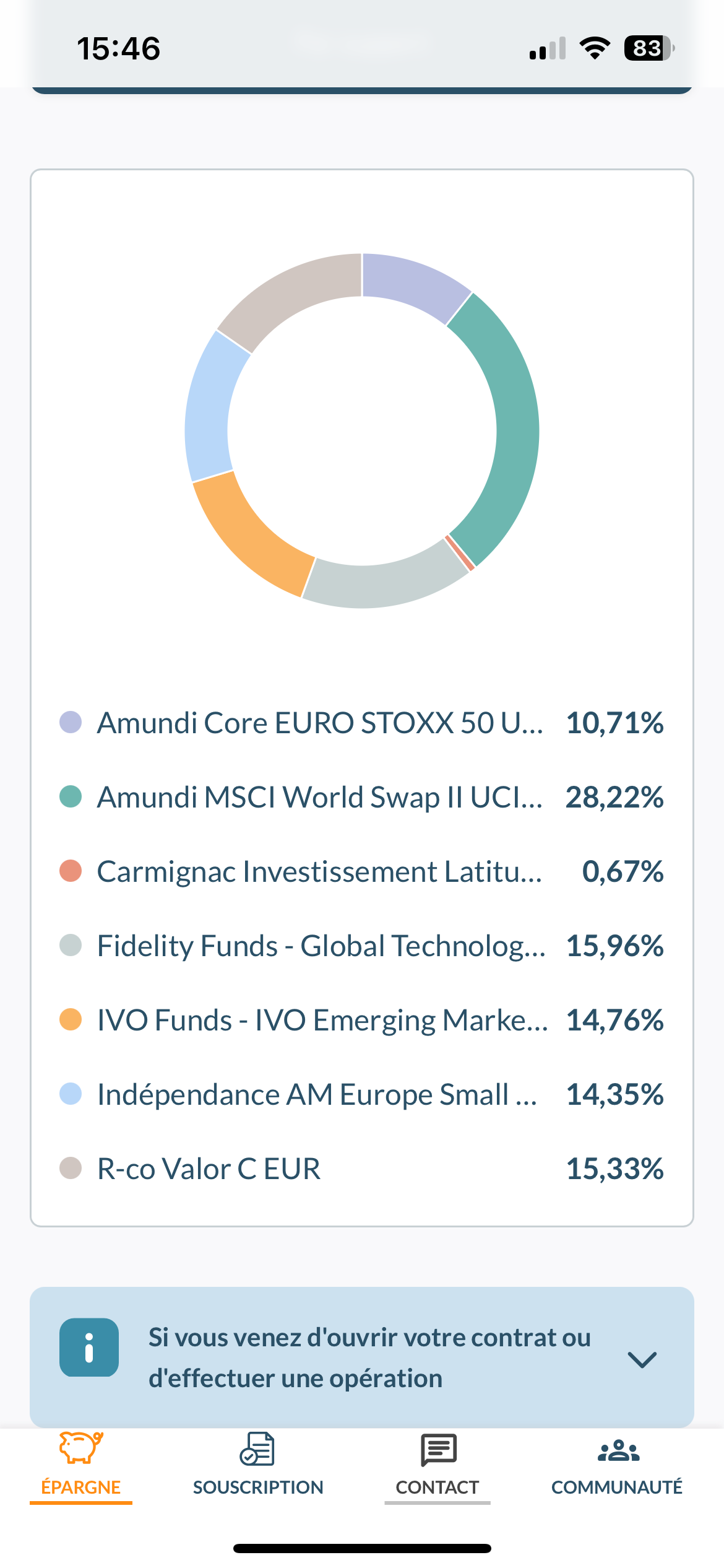 @pierre121 ton allocation en AV est à côté de la plaque. Tu as empilé des UC actives chères et redondantes Fidelity Global Tech, IVO EM, Indépendance AM Small, R-co Valor, un soupçon de Carmignac… plus deux Amundi indiciels. Addition des couches de frais typiques en AV actions 2 à 3 % par an. À ce coût, tu verses une dîme annuelle qui ronge l’intégralité de l’avantage de long terme. Et la construction est incohérente. World + EuroStoxx 50 = double comptage Europe. Un fonds tech mondial à 16 % à côté d’un World déjà surpondéré US/tech = sur-exposition non maîtrisée. Le petit poids Carmignac à 0,67 % ne sert à rien.