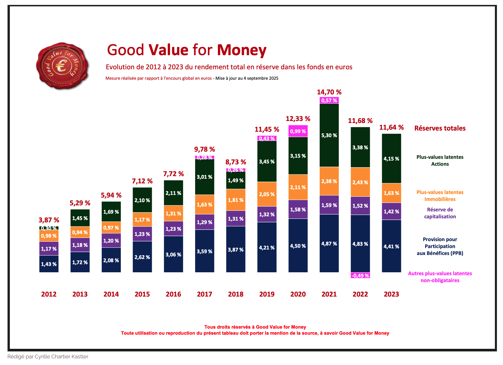 « Nous constatons que, pour l’ensemble du marché, le niveau moyen de taux de réserves globales des fonds en euros atteignait, fin 2024, 10,61 %, ce qui équivaut à 152 milliards d’euros. Ce taux était de 11,64 % un an plus tôt (168 milliards d’euros), de 11,68 % fin 2022 (170 milliards d’euros) et de 14,70 % fin 2021 (216 milliards d’euros).»