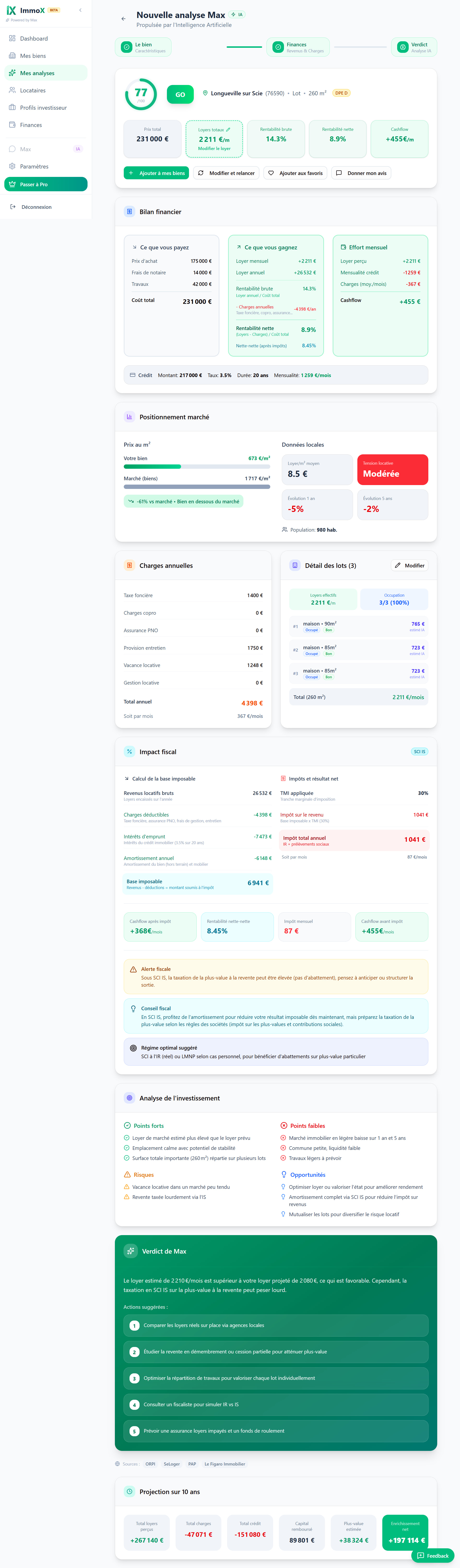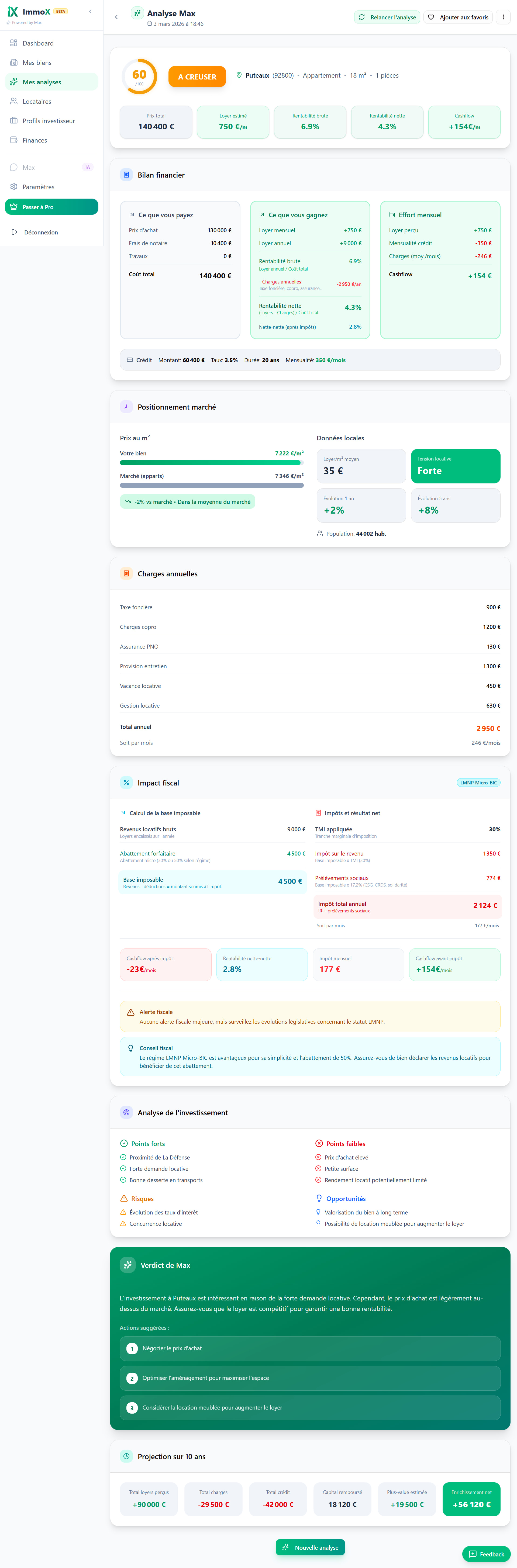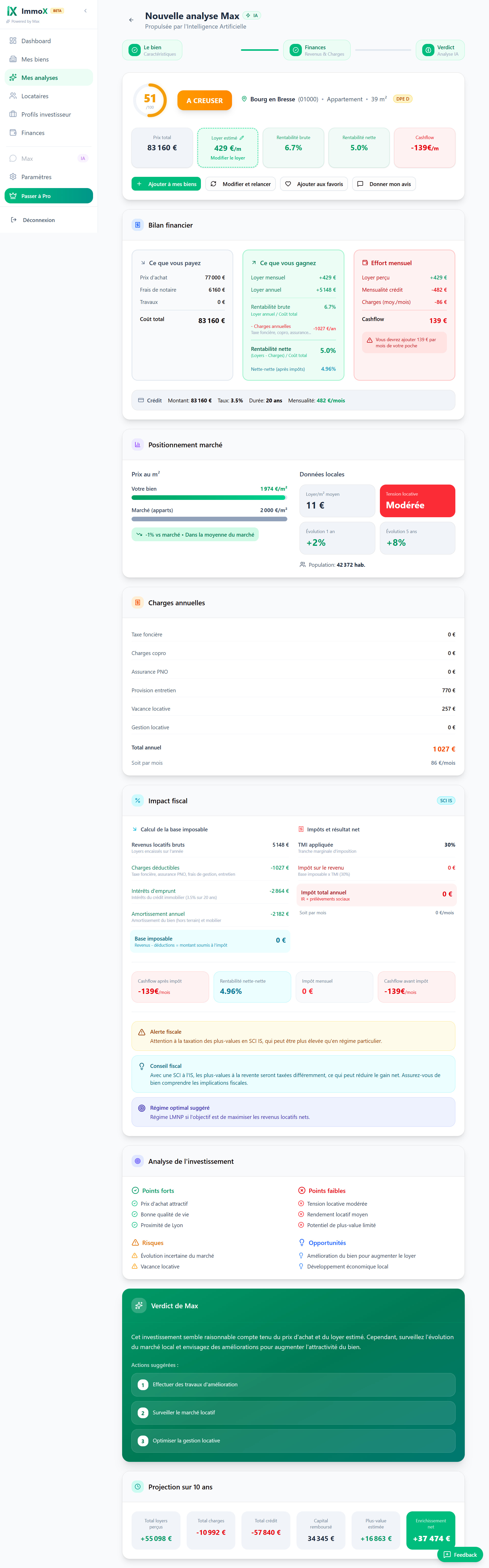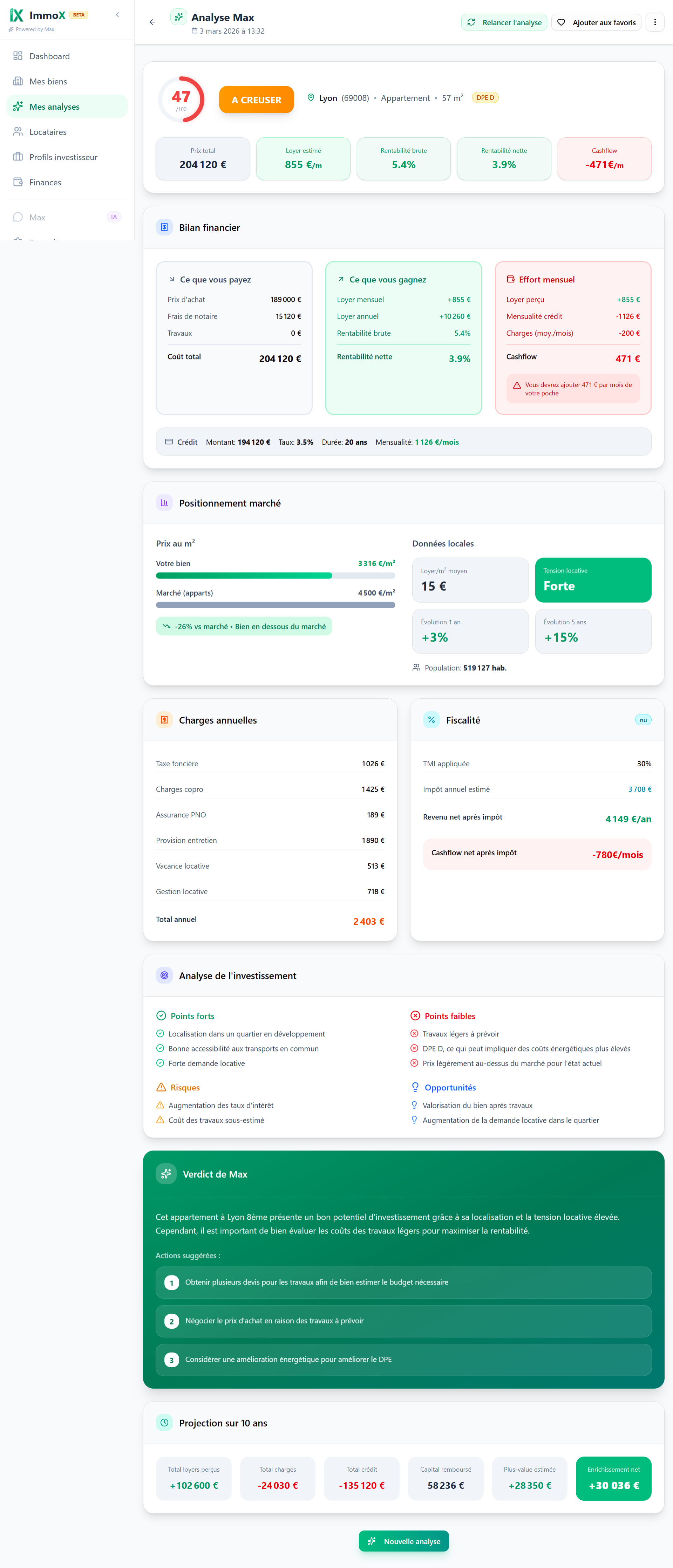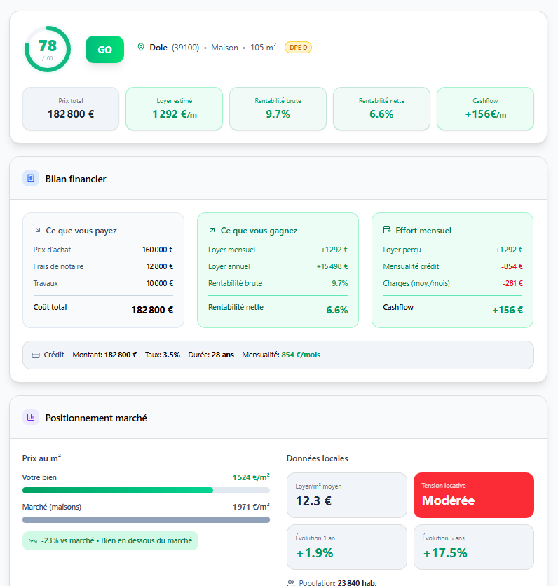 Et je vous sort l’analyse complète : loyer estimé, rendement, cashflow, prix au m² vs le marché, tension locative, charges estimées et un verdict GO / PASS / À CREUSER.