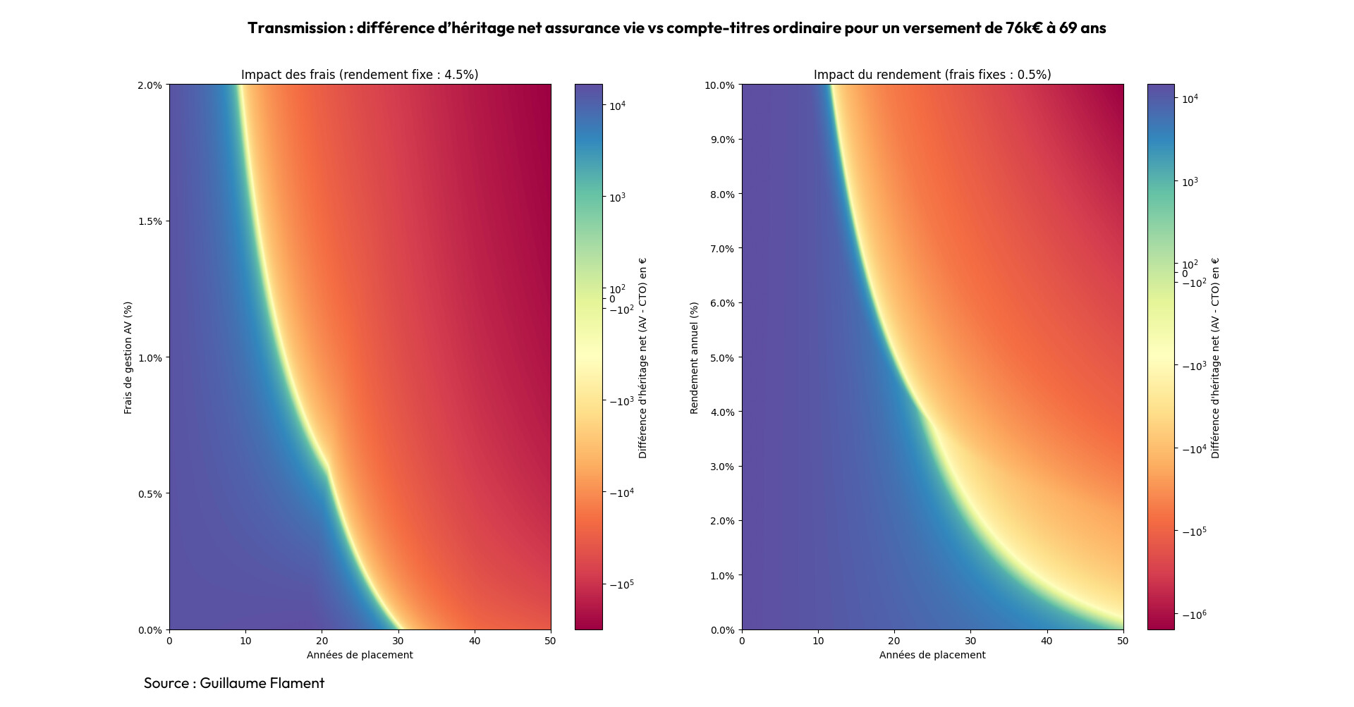 Petit teaser sur la fiscalité successorale : voici une analyse comparant AV et CTO selon les frais de gestion de l’AV et le rendement de son allocation.
