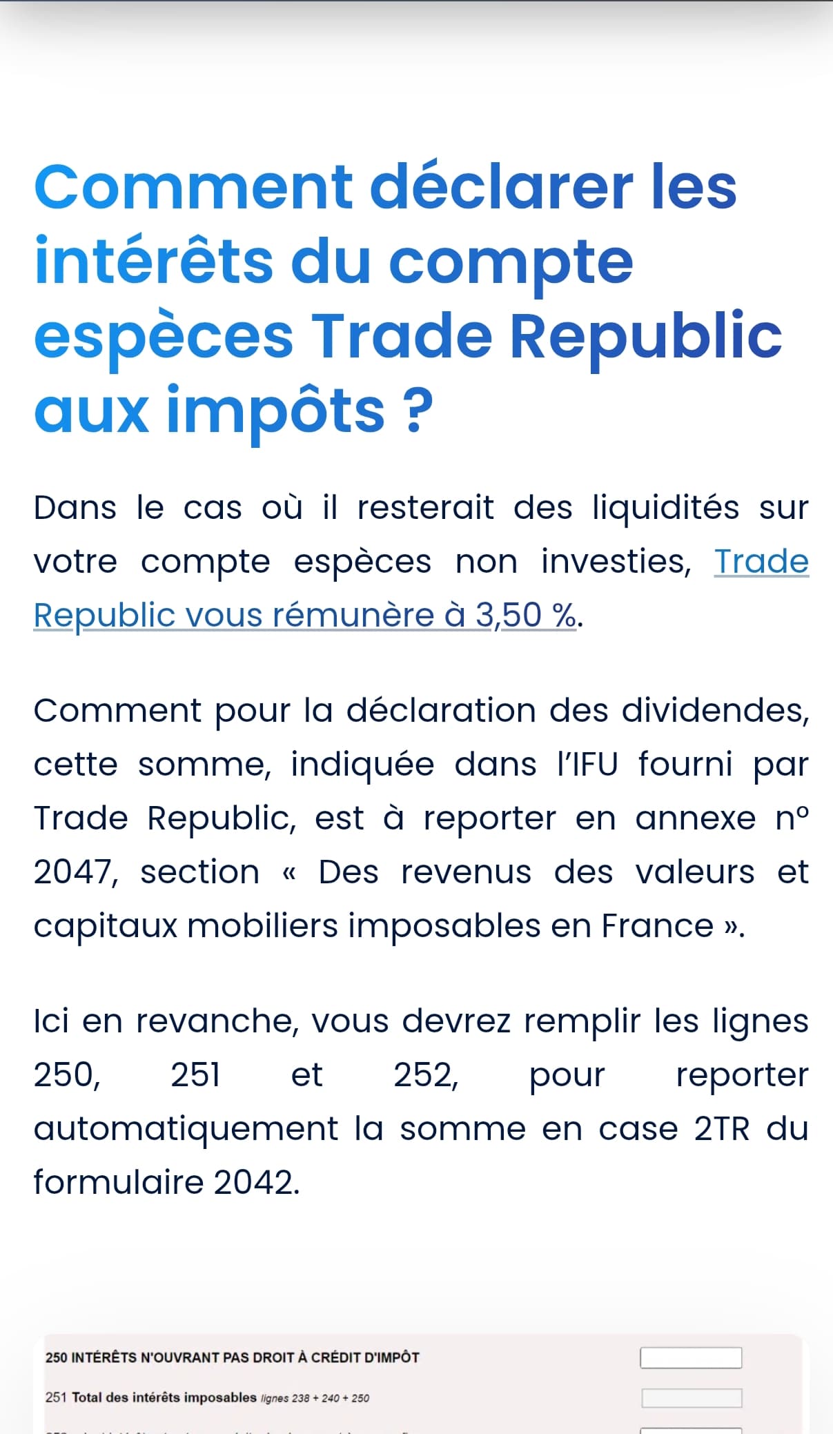 Les intérêts perçus mensuellement et les PV des cessions de titres que tu réalises sont imposables en année N+1 dès qu’ils sont générés. Pour ce faire, tu recevras vers le mois d’avril/mai un document de Trade Republic (assez bien fait depuis l’an passé) t’indiquant comment déclarer tout cela.
