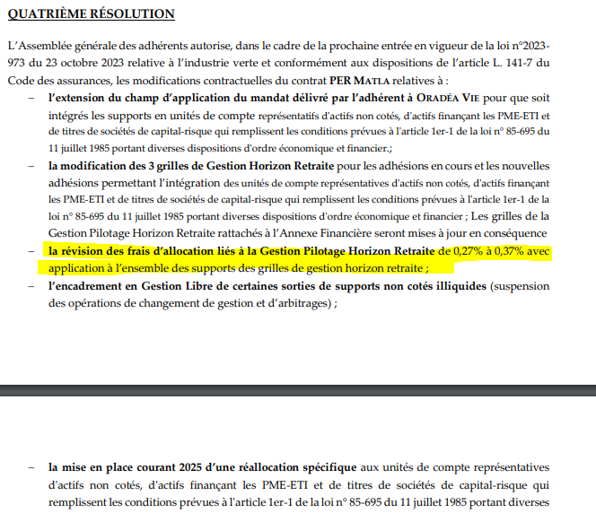 Oui, il s’agit d’un mail de bourso du 12 août 2024 qui renvoie vers un lien où l’association du PER « propose » une résolution qui dispose d’une augmentation de frais et l’intégration de l’equity pourri en 2025