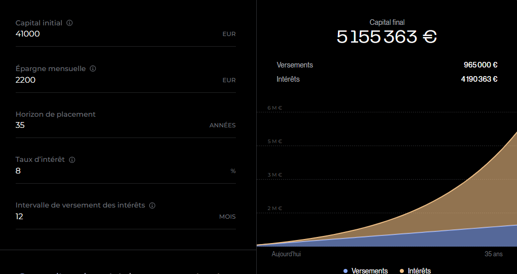 Entièrement d’accord et c’est ce que je voulais souligner dans mon message, les hypothèses ne sont pas réalistes. Mais je challenge aussi le but : pourquoi vouloir 5 millions quitte à louper des moments de vie ?