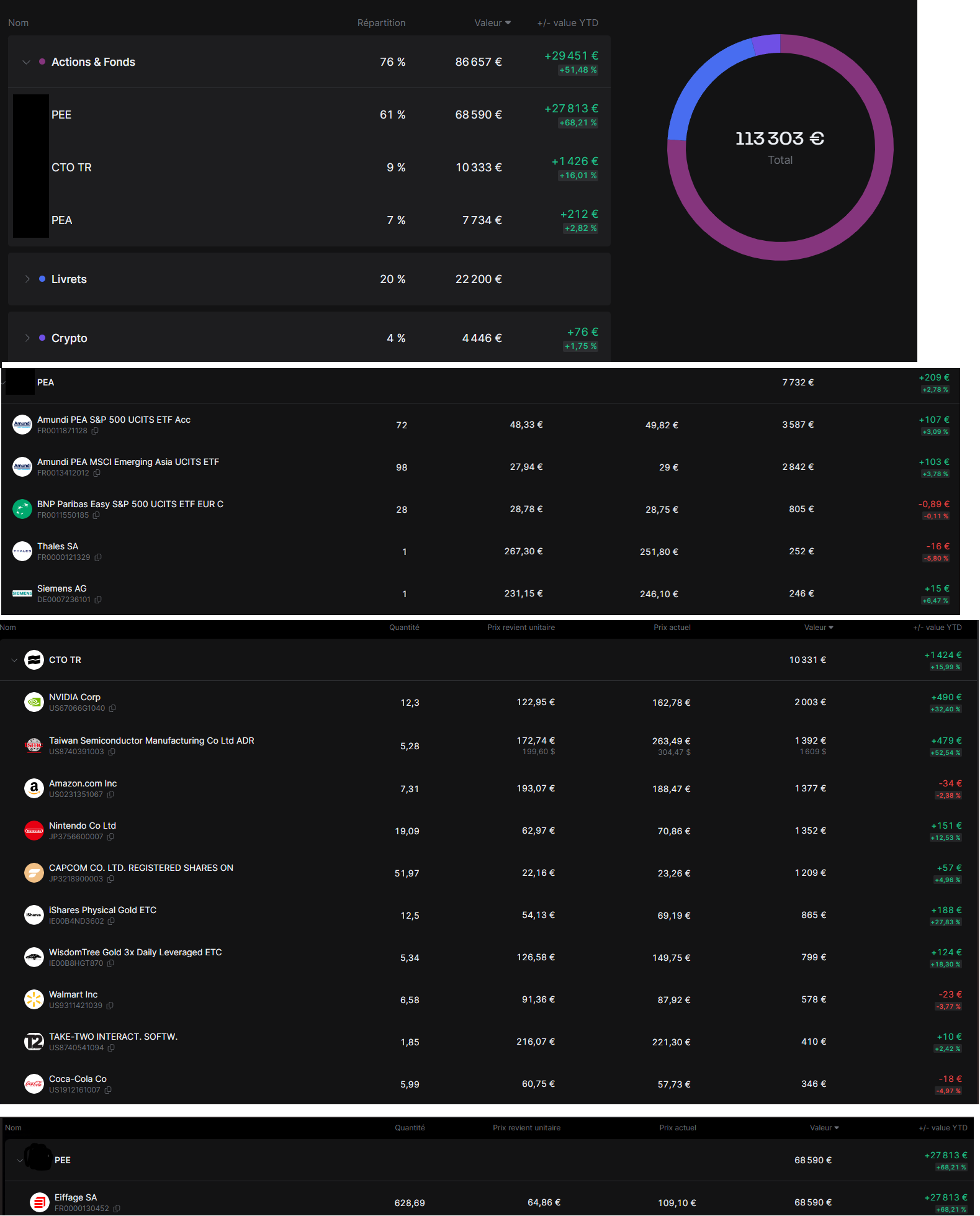 Concernant le PEE, c’est investit sur de Actions EIFFAGE (je profite d’un abondement de -20% tout les ans sur l’achat de ces actions). Je pensais justement réduire un peu mon exposition en vendant les parts qui sont déblocables dans mon PEE (5ans après l’achat) pour les allouer autre part (PEA ?).