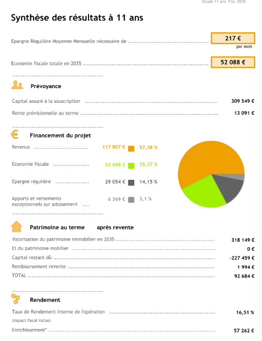 Rendement : taux de rendement interne de lâopĂ©ration (impact fiscal inclus) 16,51% (sinon 1,19% hors fiscalitĂ©), Enrichissement (inclut les surcoĂ»ts dâimpĂŽts rĂ©alisĂ©s en 2035) 57262e