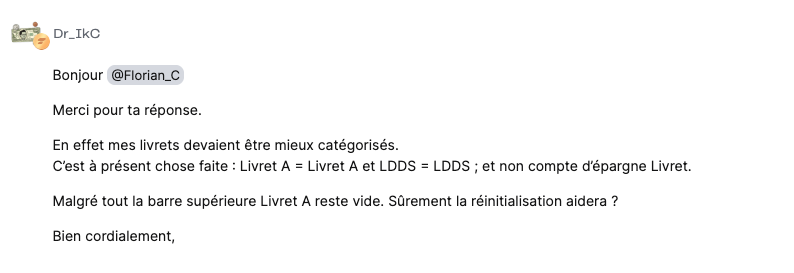 @Dr_IkC Nous travaillons activement Ă amĂ©liorer cette dĂ©tection automatique. En attendant, tu peux vĂ©rifier que tes comptes soient bien dĂ©tectĂ©s en LDDS et Livret A, et Ă©diter toi-mĂȘme si ce nâest pas le cas. Une option pour rĂ©initialiser le module sera bientĂŽt disponible, ce qui te permettra de repartir sur une base propre une fois tes comptes correctement classifiĂ©s.