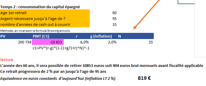 Le retrait constant possible est de 819€ brut par mois ( en tenant compte d’une inflation de 2 % ) .