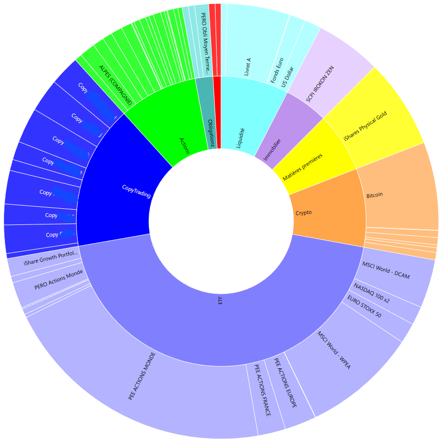 Et avec une rĂ©partition qui me convient bien. Des ETF (sĂ»rement un peu de mĂ©nage Ă faire), de la copy, du stock-picking « pour le fun » sur des entreprises que jâaime bien, de la crypto, un poil dâimmoâŠ