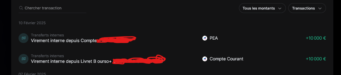 - Mouvement inter-compte. Livret A → compte courant (1 ligne +X euros) puis compte courant vers PEA (1 ligne identique +X euros)