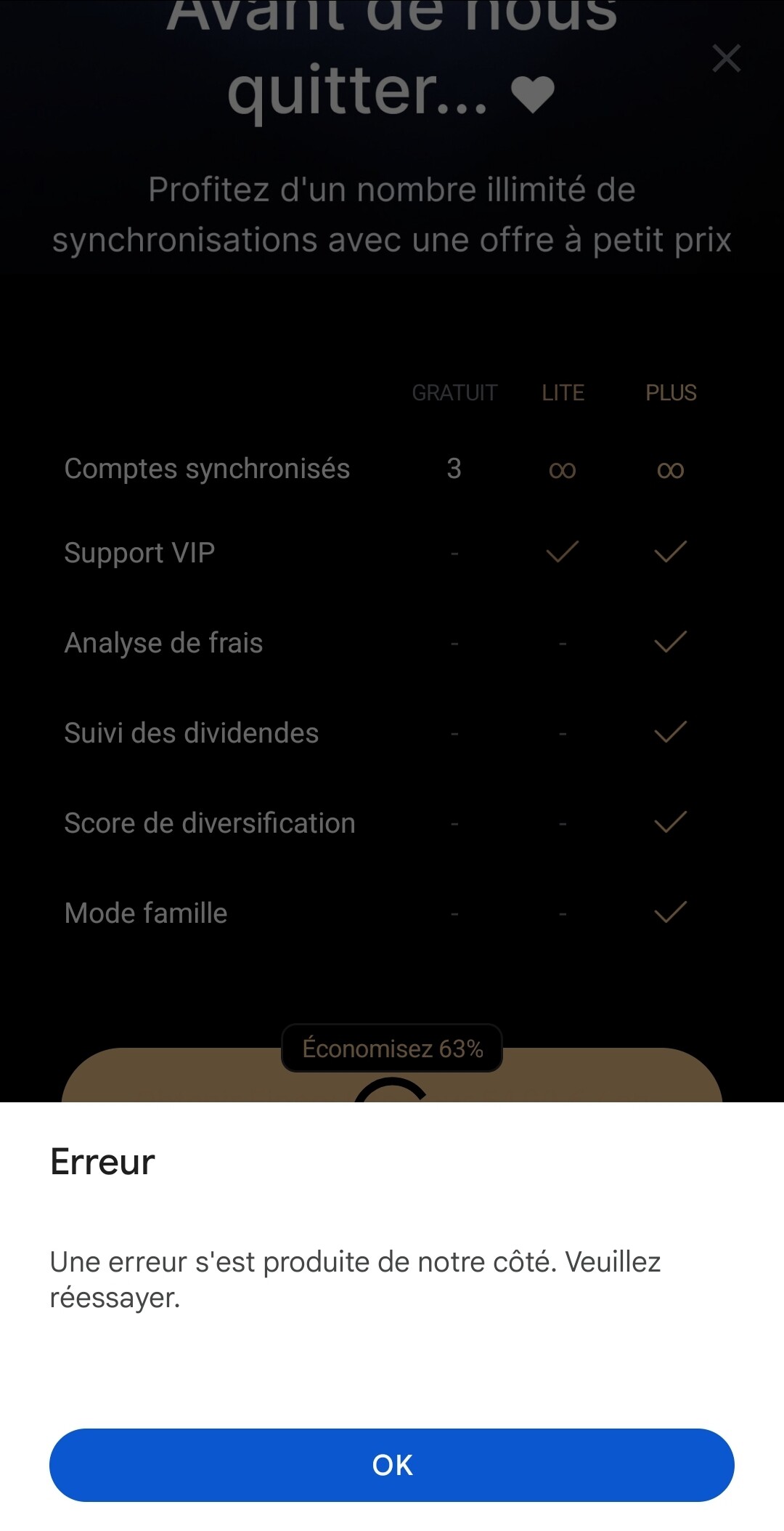 J’ai l’essaie gratuit de Finary+, et il m’est impossible de passer sur Finary lite (problème interne, cf screen).