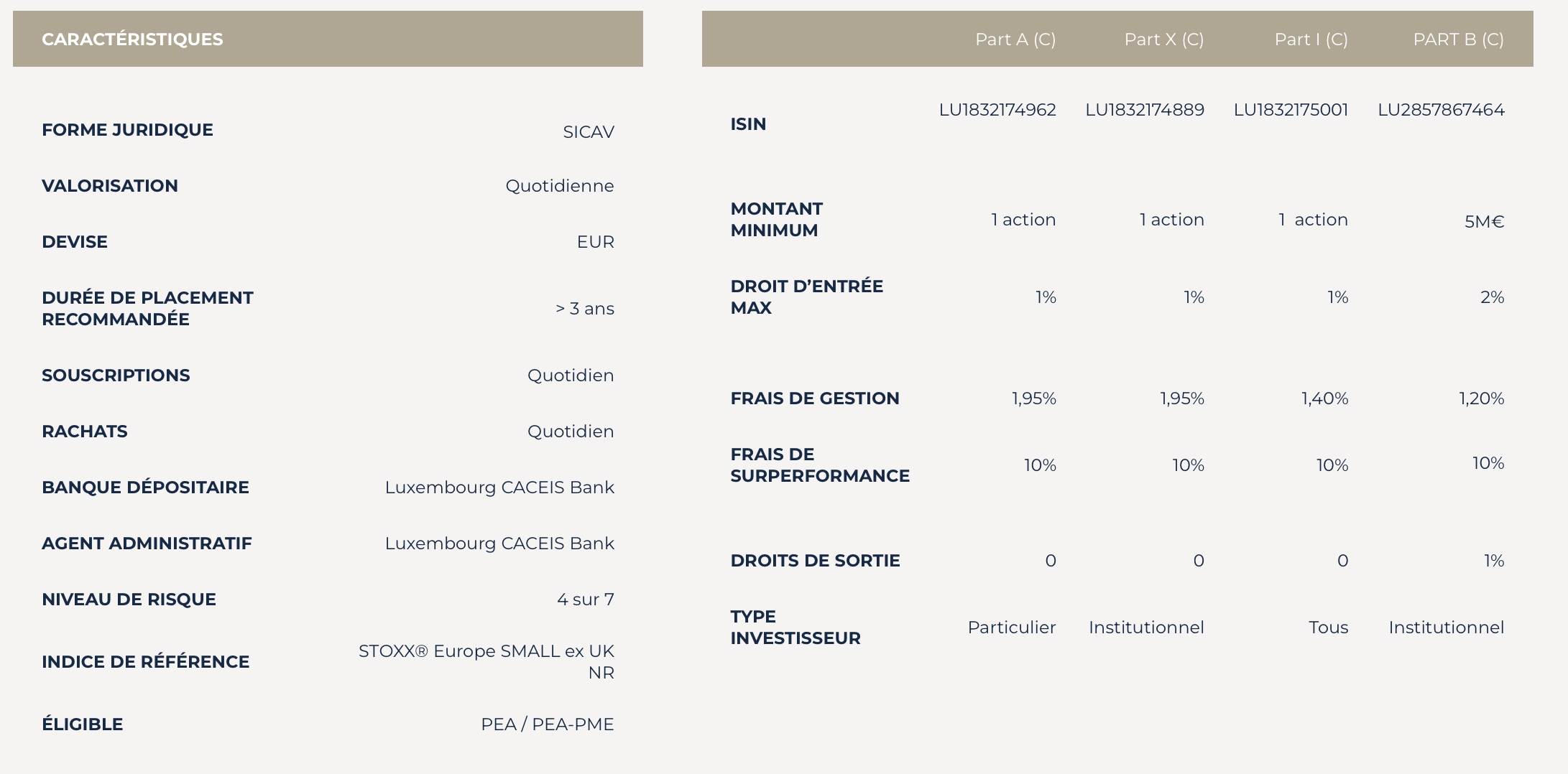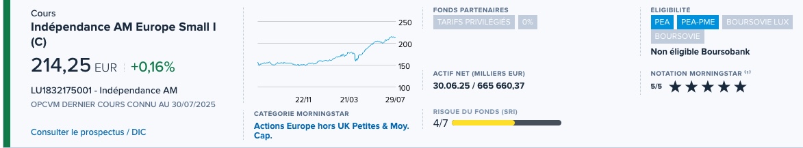 Cette part I (des frais à l’achat supplémentaires, mais moins de frais courants annuels, donc plus intéressante à long terme) peut parfaitement être achetée chez Fortuneo (et bien entendu sans 500k€ minimum): Fortuneo - Indépendance AM Europe Small I (C) – comme l’indiquait ShadowSpirit