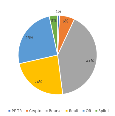 Mais je mây connais assez mal, comme dit prĂ©cĂ©demment, ma rĂ©partition est 25% or, 25% Realt (immo usa), 40% bourse, et les 10% restants « exotique » (splint, Private Equity TR, cryptosâŠ)