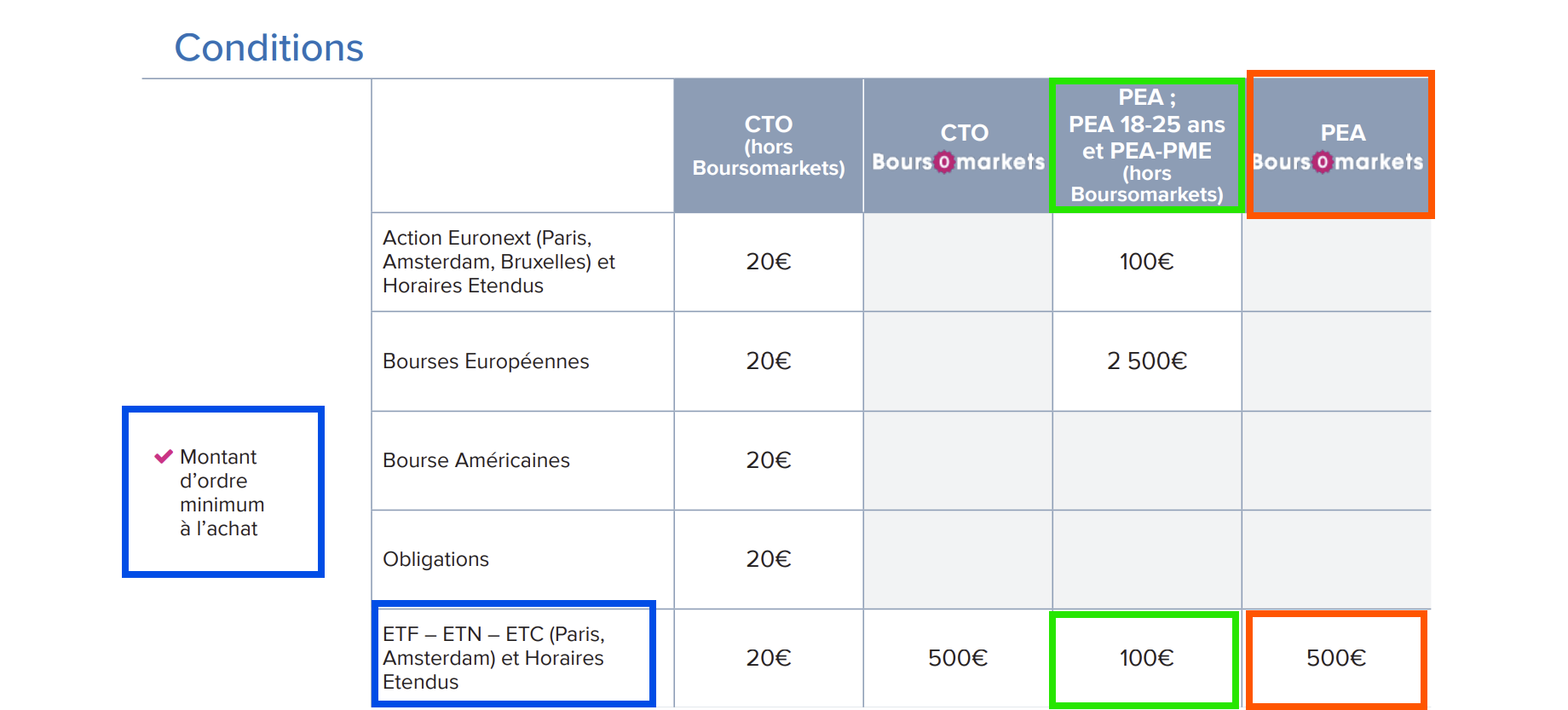 Sur Boursobank, l’investissement via ETF sur leur PEA doit au moins être égal à 100 €.