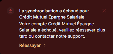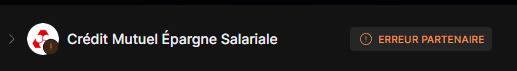 Lors de la liaison de mon PEG du Crédit Mutuel Epargne Salariale, Finary récupère correctement le solde global du compte mais aucun détail n’est affiché + une « Erreur partenaire » m’invitant à réessayer la synchronisation, après avoir synchronisé, un pop-up sur Finary s’affiche