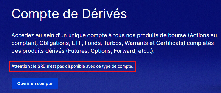 - Compte dérivé : un CTO avec en plus l’accès à des dérivés (Futures, Options, Forward… bref, les cochonneries qu’on évite XD ) mais qui n’a pas accès aux SRD