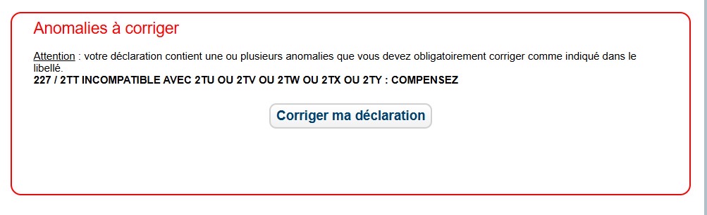 Et j’ai donc renseigné en 2TY le montant de la perte irrécouvrable mais lorsque j’essaie de valider ma déclaration le message ci-dessous apparaît :