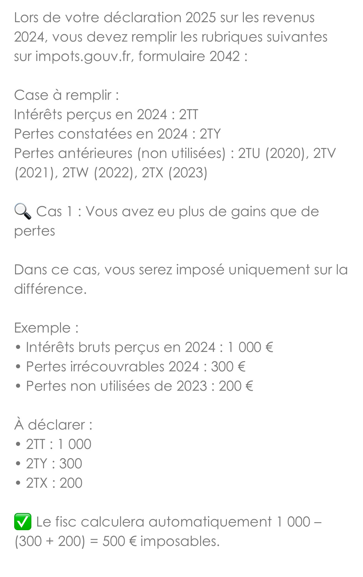 Et si cette méthode est bien la bonne je bloque toujours car la déclaration en 2TT se faisant par plateforme, je ne vois pas comment y ajouter ma perte puisque je n’ai pas reçu d’intérêts sur cette plateformes me permettent de déduire la perte et on ne peut pas y renseigner de montant négatif.