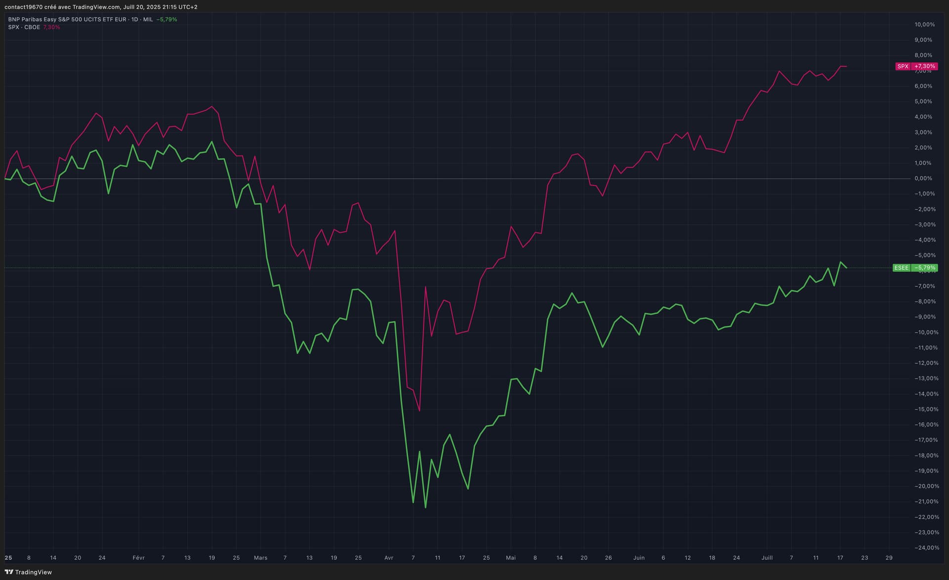 Ce que l’on dit rarement aux investisseurs débutants, c’est que la devise peut annuler complètement la performance de l’indice. Si le S&P 500 gagne +10 % mais que le dollar perd -10 % par rapport à l’euro, alors la performance en euro devient nulle. Actuellement, l’euro s’est fortement apprécié face au dollar, dans une tendance historique (le dollar n’a pas connu une telle faiblesse depuis 20 ans ou plus).