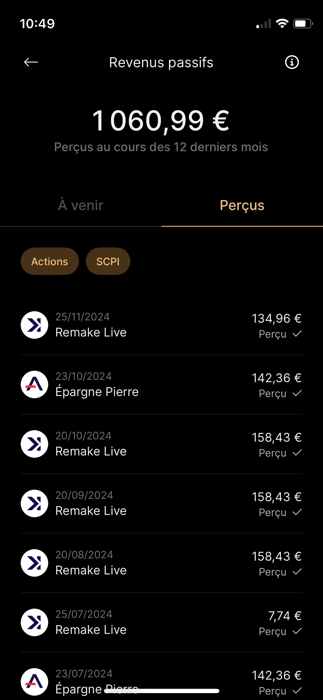 Les dividendes perçus de ma SCPI Remake live via mon AV Linxea Spirit 2 n’apparaissent plus sur Finary depuis Août, alors qu’ils sont bien présents sur Linxea : mes revenus passifs sont donc complètement biaisés.