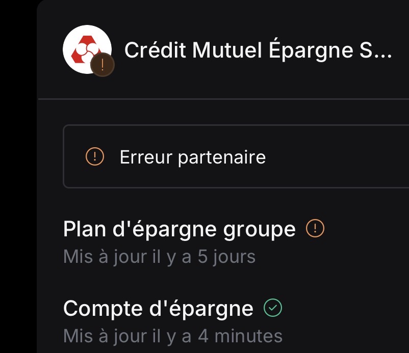 Lors de la liaison de mon PEG du CrĂ©dit Mutuel Epargne Salariale, Finary rĂ©cupĂšre correctement le solde global du compte mais aucun dĂ©tail nâest affichĂ© + une « Erreur partenaire » mâinvitant Ă rĂ©essayer la synchronisation, aprĂšs avoir synchronisĂ©, un pop-up sur Finary sâaffiche