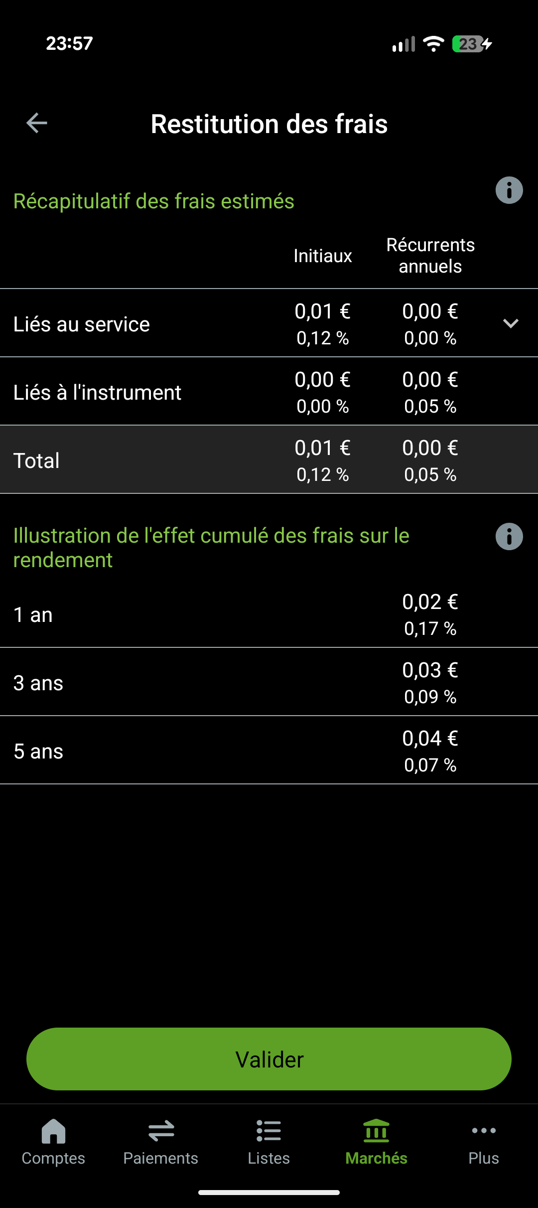 Voilà le récapitulatif des frais si je veux acheter du I500 sur Fortuneo avec mon offre starter: