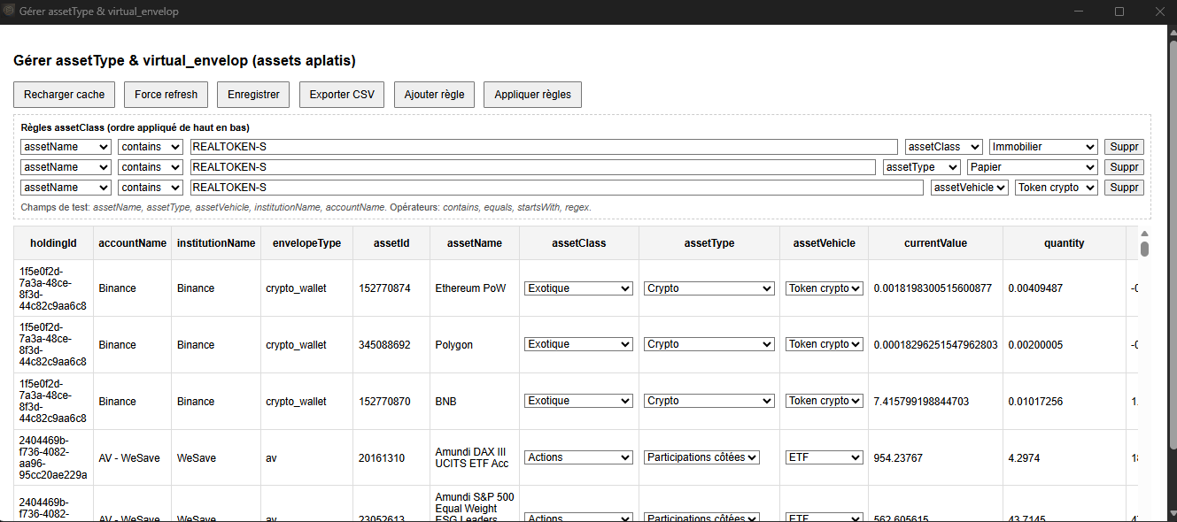 RajoutĂ© une fonction « GĂ©rer assetType & virtual_envelop »: en gros cela vous permet de modifier la catĂ©gorisation de vos assets selon votre propre lecture de « classe dâinvestissement », « type », et « vĂ©hicule ».