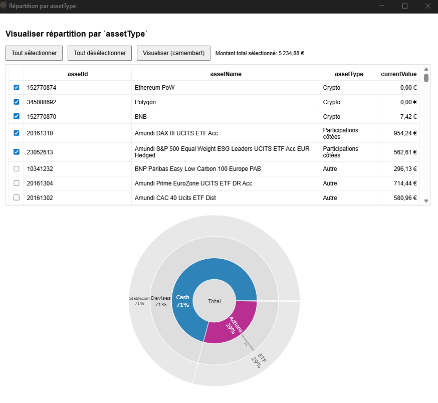 RajoutĂ© une fonction « Visualisation » de votre distribution personnalisĂ©e. Il sâagit dâun sunburst qui part des classes dâactifs, puis type dâactif, puis vĂ©hicule de lâactif. Vous pouvez sĂ©lection tout ou une partie de vos assets.