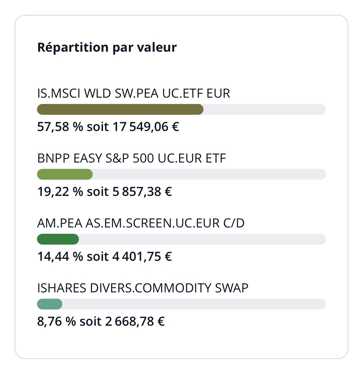 J’hésite à revendre le S&P mais ce serait peut-être une bonne idée de basculer son montant vers le World. Sinon comme tu vois j’ai de l’émergent et du matières premières.