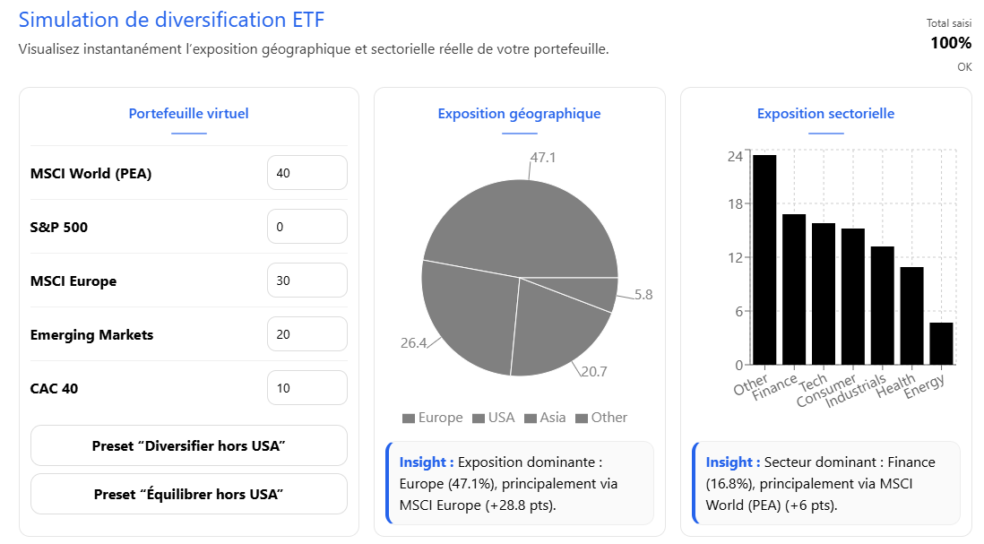 Si je dis « je veux 30% USA, 30% Europe, 30% Asie » et/ou « x% de tech, x% de … » : peut-être avec des curseurs sur chaque zone/secteur ?