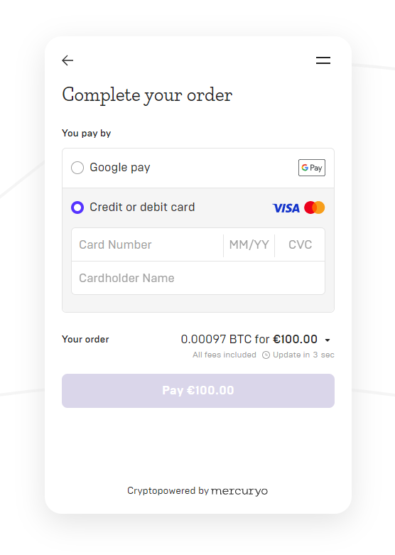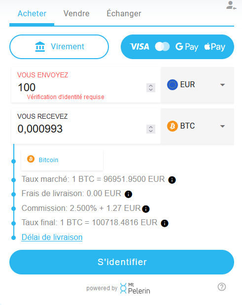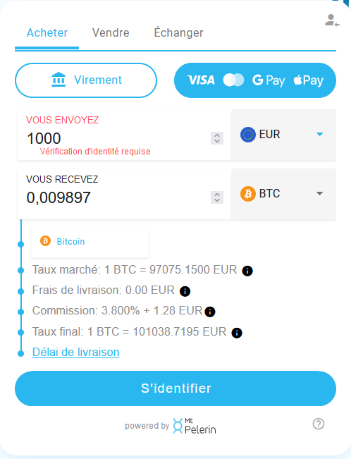 Si tu cliques par exemple sur Mercuryo (le soit disant meilleur deal de la liste) et que tu avances vers l’achat, au moment de payer surprise : pour €100 tu ne reçois plus que 0.00097 BTC au lieu des 0.00101 BTC affichés au début :