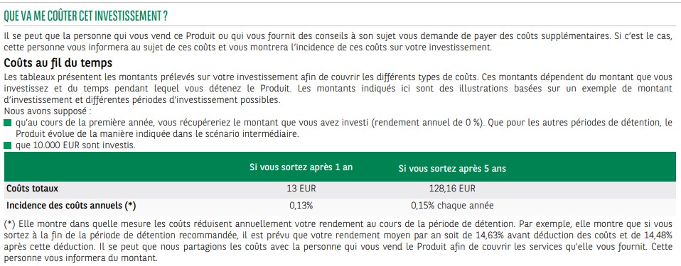 Les frais annuels sont indiqué à 0.13% mais à 0.15% si on garde l’investissement au moins 5 ans.