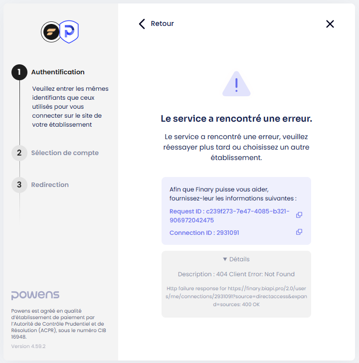 J’ai refait un essai ce matin, peu avant 10h. Après avoir sélectionné le nom de la banque en question suivi de « Épargne Salariale » puis choisi la connexion via powens, je saisis mon identifiant et mon mot de passe. Je reçois ensuite un code par e-mail, mais une fois entré, quelques secondes plus tard, le message d’erreur suivant apparaît :