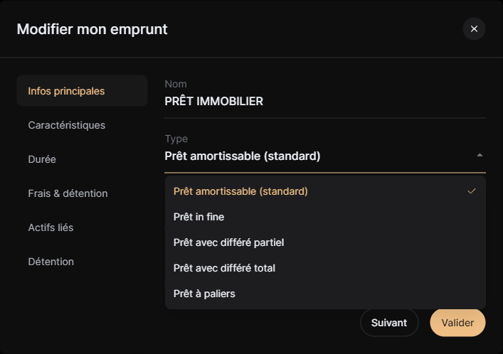 Quand tu souhaites compléter ton patrimoine, il faut choisir la catégorie emprunts