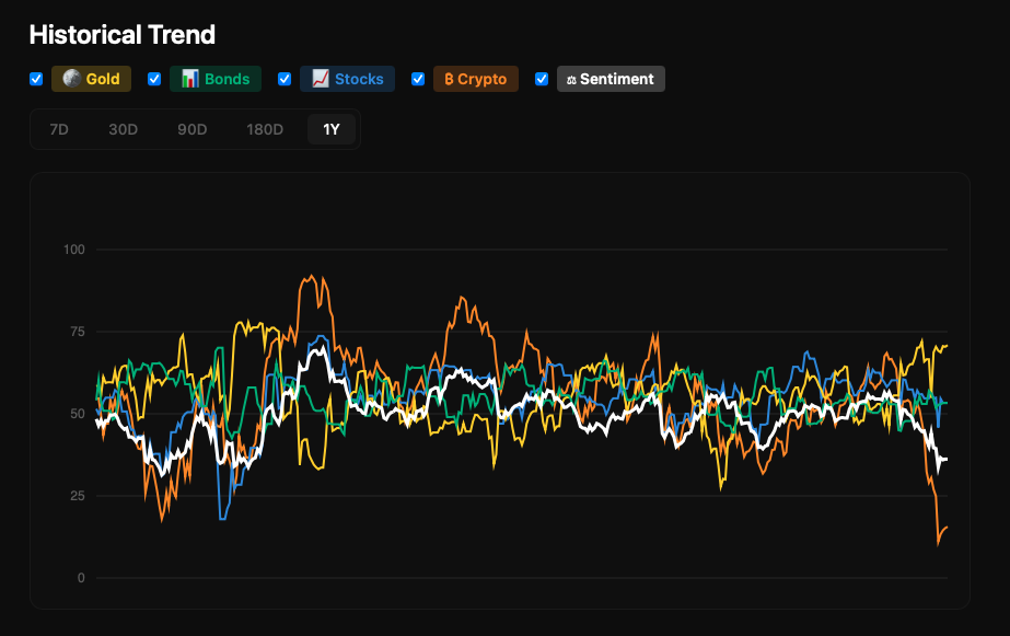 À la base je cherchais un indice Fear & Greed pour l’or. Le seul qui existe est celui de JM Bullion… sauf que JM Bullion est un vendeur d’or. Difficile de leur faire confiance sur le bon moment pour acheter quand ils ont un intérêt direct à ce que vous achetiez. Du coup j’ai construit le mien, et j’en ai profité pour en faire 4 : Or, Obligations, Actions et Crypto. Chacun est basé sur 5 à 7 indicateurs de marché (volatilité, momentum, volumes, performance relative, etc.).