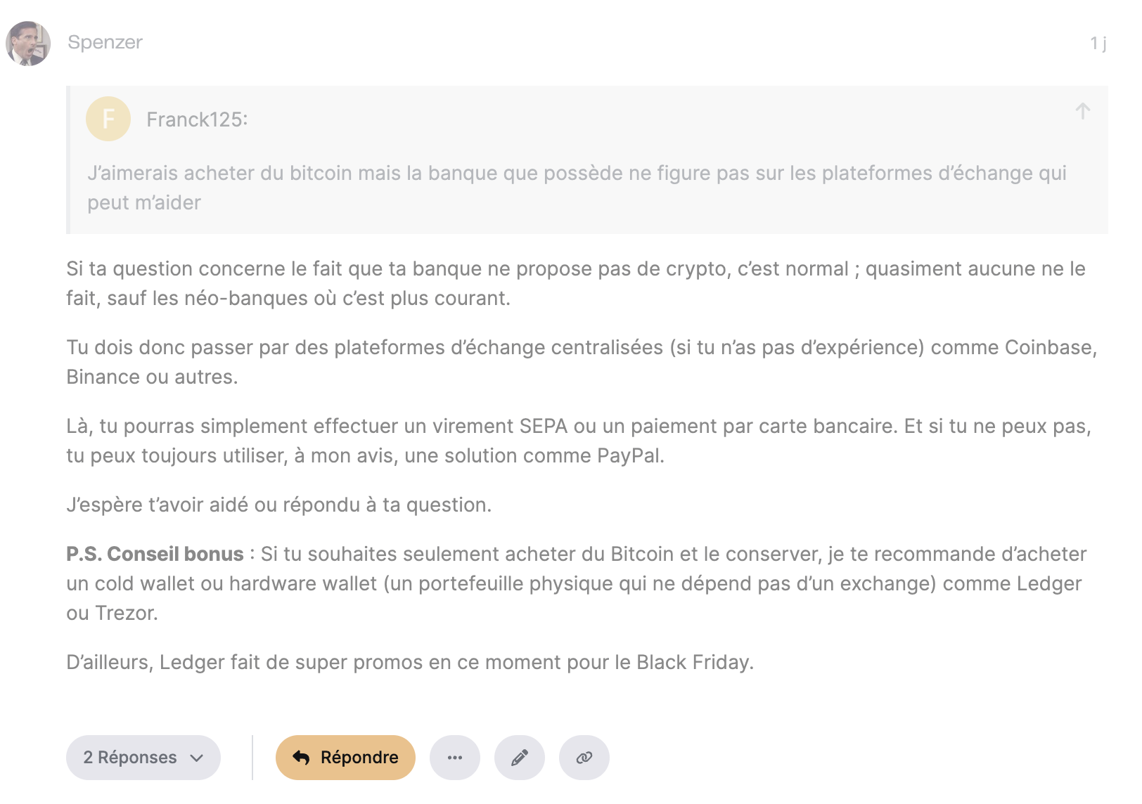 Sur le sujet suivant : https://community.finary.com/t/jaimerais-acheter-du-bitcoin-mais-la-banque-que-possede-ne-figure-pas-sur-les-plateformes-dechange-qui-peut-maider/19641 jâai voulu apporter mon aide.