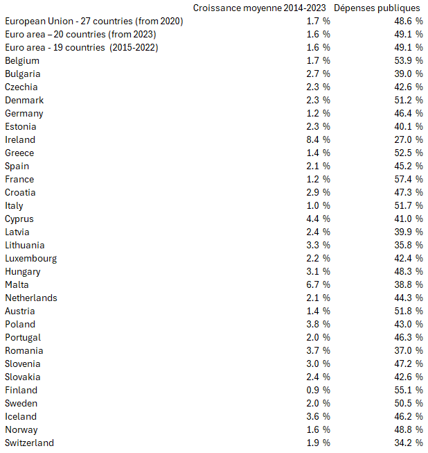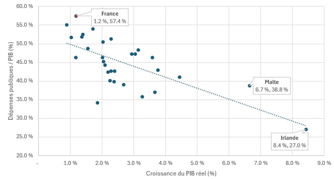 Il existe une corrĂ©lation forte entre croissance et taux de dĂ©penses publiques/PIB dans les pays de lâUE (+ suisse et NorvĂšge sur le graphique)