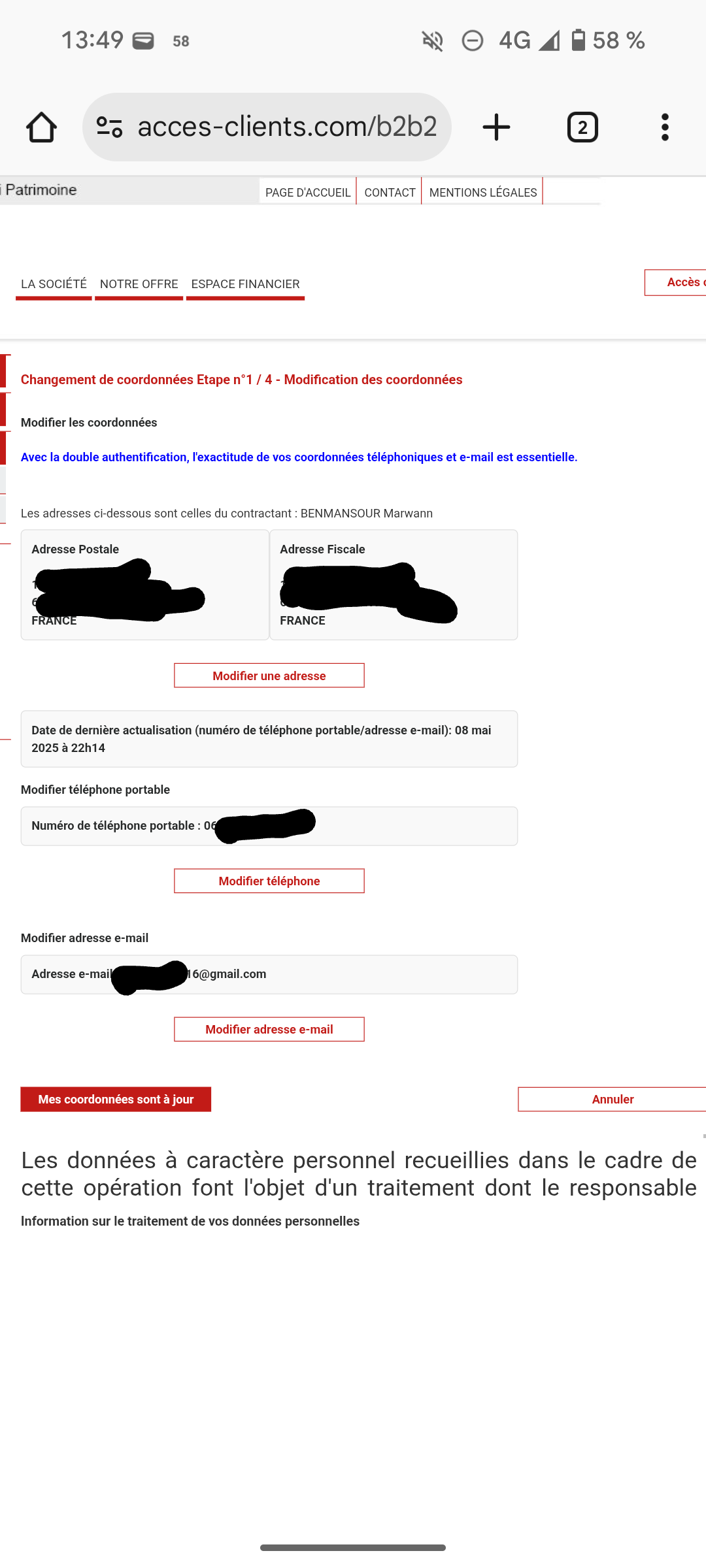 Si oui, peux-tu cliquer sur le lien Modifications de coordonnées ?