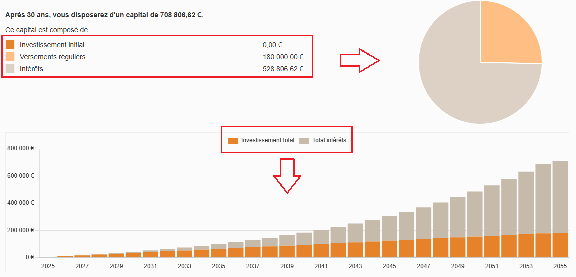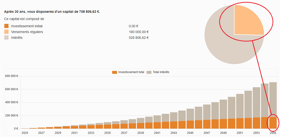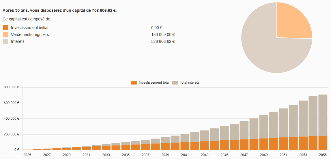 Une calculatrice financière vous permet de visualiser cet effet et de vous rendre compte à quel point il est puissant avec le temps (exemple avec 500 euros/mois avec un taux de 8%/an pendant 30 ans):