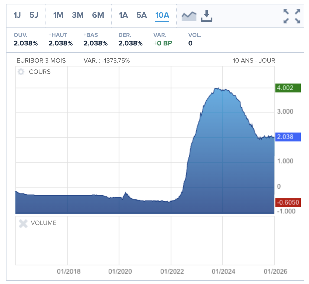 Mais le rendement dépend de l’indice Euribor 3 Mois. Il ne doit pas être au dessus de 3,2% pour avoir des coupons. Sachant que l’indice est resté plus d’un an et demi au dessus de 3,2% en 2023 et 2024.