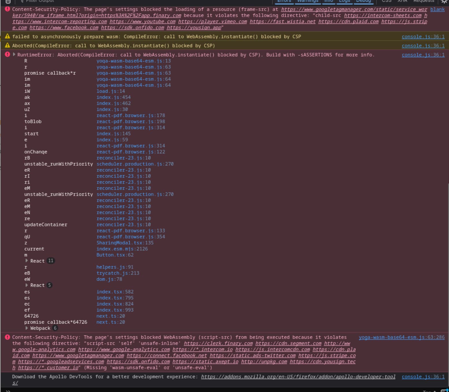 Capture dâĂ©cran des erreurs de la console Firefox. Jâai pareil dans Chrome.