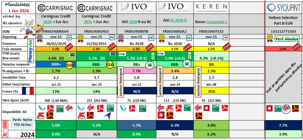 Tu es sur de ton calcul ? les specialistes du secteur sur channel moneyvox qui suivent depuis des annnĂ©es les fonds datĂ©s partagent un reporting regulier indiquant bien une performance net de 6,3% pour 2025 par exemple sur IVO 2030, certes tu retires les frais de gestion du contrat Spirica de 0,5% et tu est Ă 5,8%⊠donc je ne comprends pas tres bien comment tu arrives a 2,8% âŠ