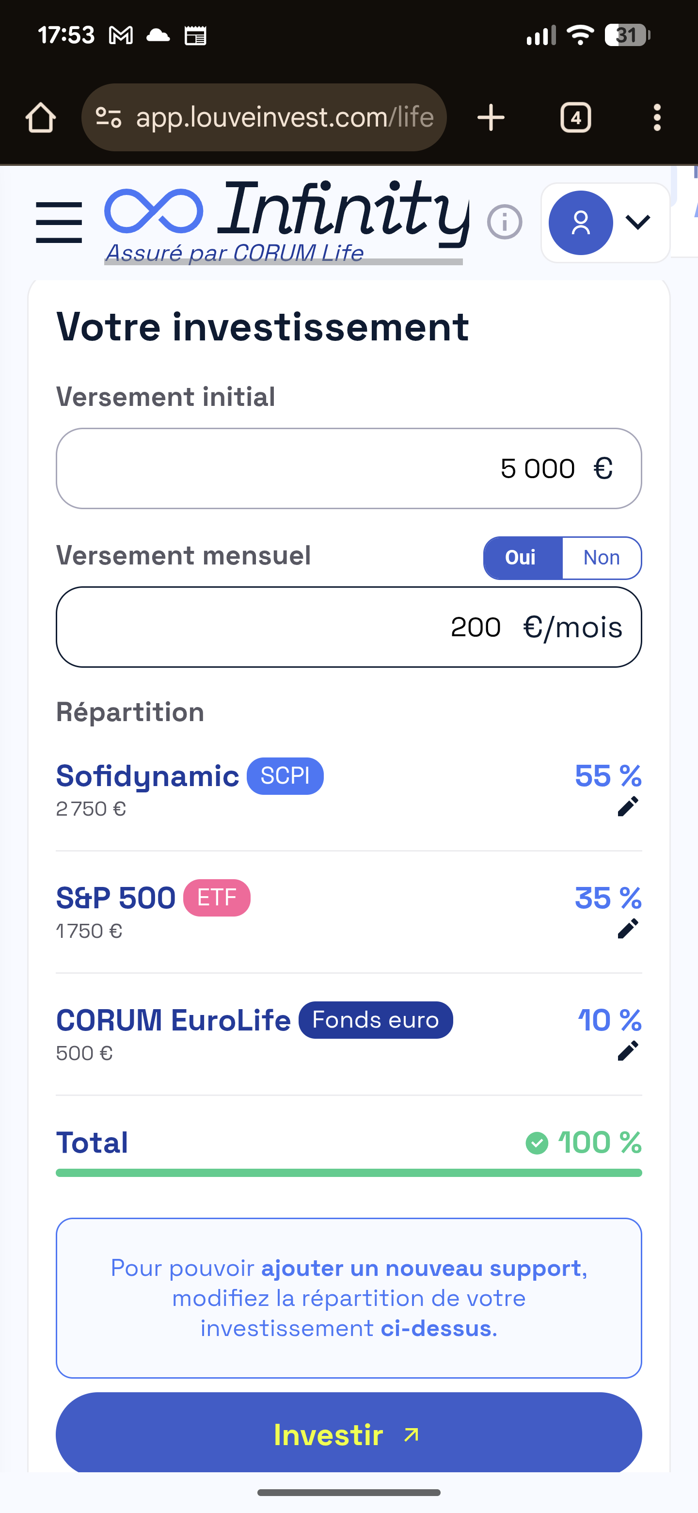 Le problĂšme câest quâĂ©tant dĂ©jĂ Ă©quipĂ© de ces contrats je me vois mal ouvrir ce nouveau oĂč je vais retrouver les mĂȘmes ETF et SCPI. LâĂ©conomie sur les frais dâenveloppe est minime sur la partie ETF (0,39% contre 0.50% sur LC ou LS2 donc 0.11%) par contre la diffĂ©rence est rĂ©elle sur les SCPI (0% de frais dâenveloppe sur CORUM LIFE contre 0.39% ici).