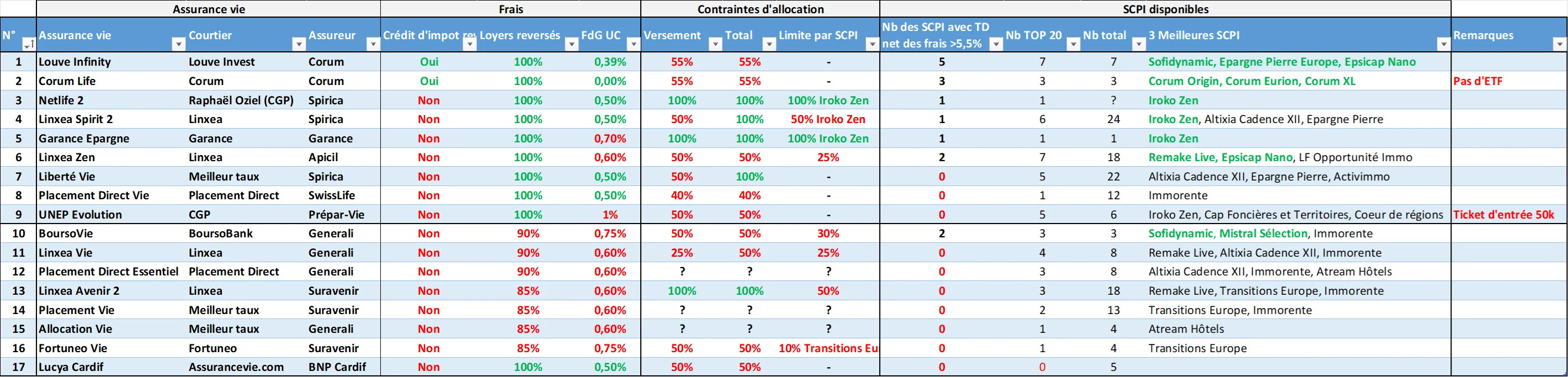 peut etre au niveau ETF câest intĂ©ressant, mais au niveau SCPI, je suis déçu des frais Louve (plutĂŽt frais Corrum Life) vis a vis de Spirite 2 par exemple, yâa pas de frais de gestion de lâUC propre en plus de frais de de gestion du contrat de lâAV , pour les SCPI AV/Spirite 2, par contre point pour Louve, câest les loyer bruts et non pas net dâimpots Ă©trangers quâon touche en AV. bien sur je ne parle pas des frais de gestion de la SCPI qui sont les memes soit en directe ou en AV.