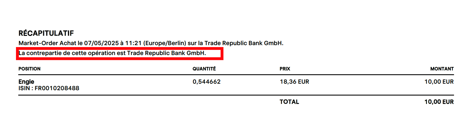 « La contrepartie de cette opération est Trade Republic Bank GmbH. »