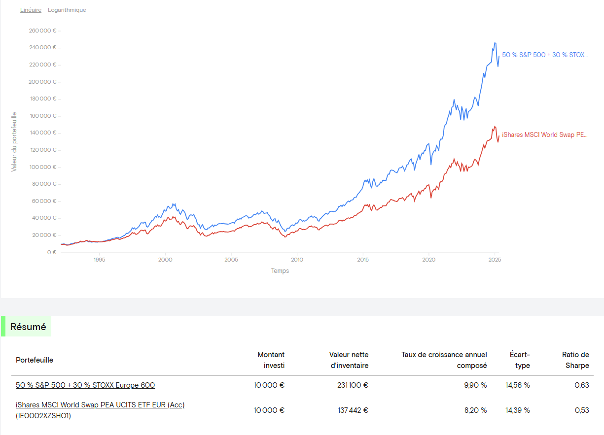 Apres avoir balayé de nombreux poste de ce forum concernant le choix entre un portefeuille avec ETF world et un autre portefeuille avec un S&P 500 à 70% et un STOXX 600 à 30%. J’ai réalisé un petit backtest