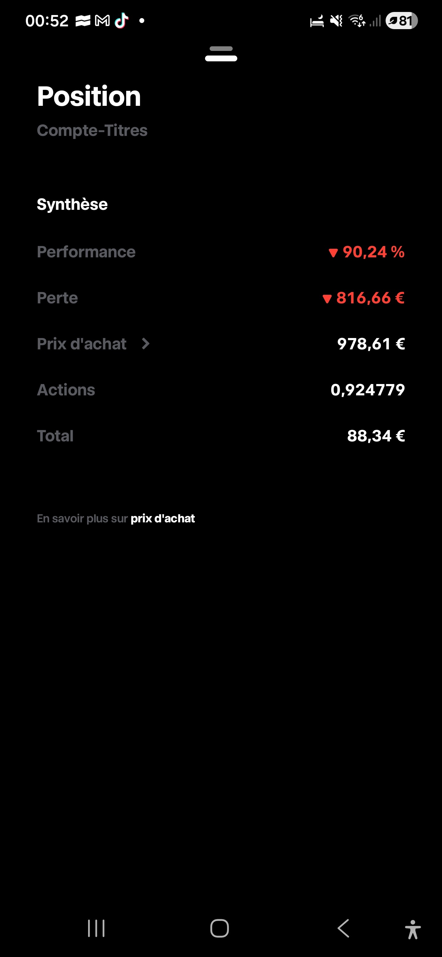J’ai constaté depuis vendredi dernier que Ça m’affiche : prix moyen d’achat 978€ l’action , or il n’est que de 97€ réellement. Il m’affiche 816€ de perte -90% de performance alors que je n’ai investi pour l’instant qu’environ 100€.