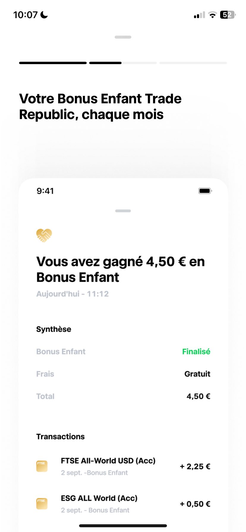 Avec le « Bonus Enfant Trade Republic », Trade Republic devient la première banque au monde à aller encore plus loin : alors que les plans d’épargne en ETF chez Trade Republic ont toujours été exécutés gratuitement, Trade Republic et Vanguard réinvestissent désormais également chaque mois, directement dans l’ETF, les frais de gestion de certains ETF Vanguard, et ce jusqu’aux 18 ans de l’enfant. Sont inclus non seulement le FTSE All World, mais aussi le Vanguard ESG Global All Cap et le Vanguard LifeStrategy