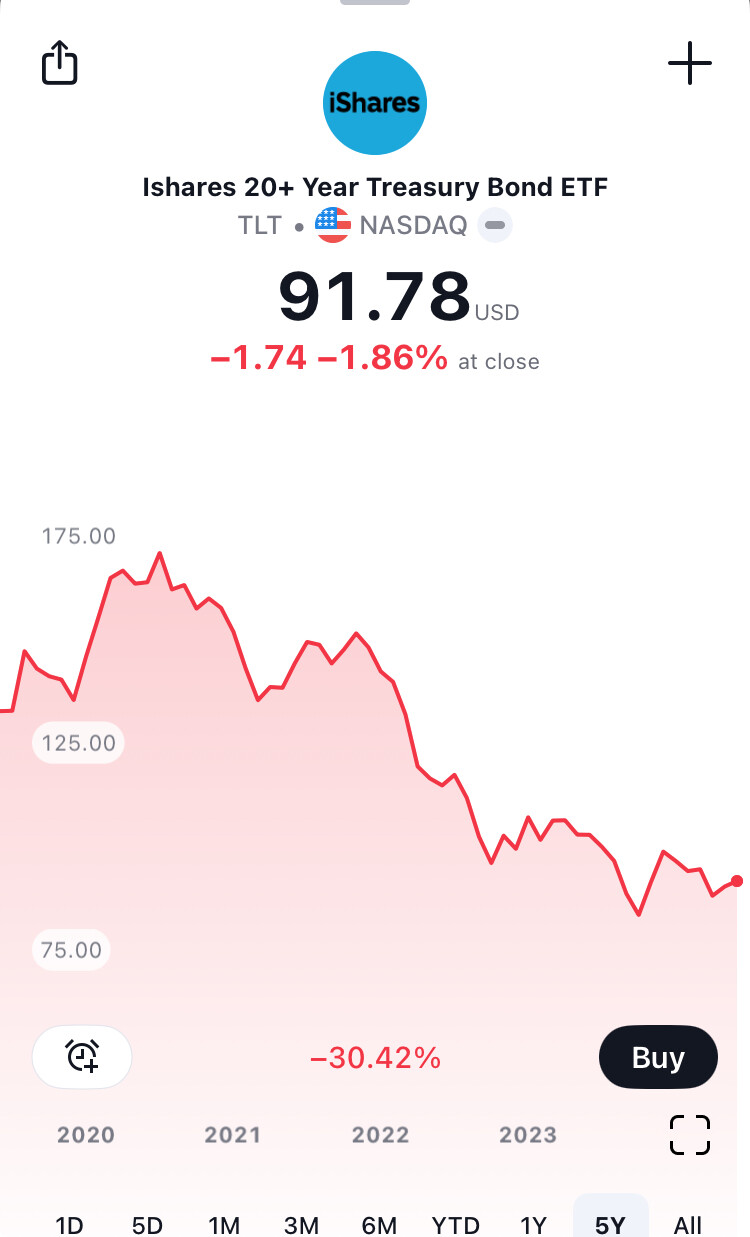 Les obligations sont loins d’être sans risques, celui qui t’as dis ça est un escroc. Maintenant si tu vas à maturité, et si la contre partie ne fait pas défaut et si ton co-investisseur (TR) ne te lache pas ça ce bien se passer. Je te mets le graph des oblig du trésor US à 20 ans. Et si le crack obligataire de 2022 ne te parle pas, fuis!!!