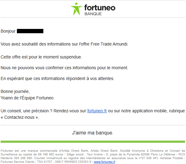 - le 24/01: « Concernant lâoffre FreeTrade Amundi, celle-ci a Ă©tĂ© suspendue jusquâĂ nouvel ordre. »